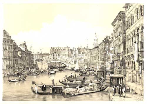 "Venice - The Rialto"Malerische Ansicht von Venedig mit der Rialtobrücke. Tonlithographie von Samuel Prout, London c1835, 28,4 x 40 cm.