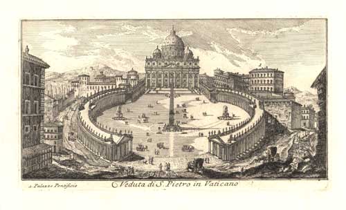 "Veduta di S. Pietro in Vaticano"View of S. Peter's in Rome. From 'Nuova Raccolta delle piu' belle vedute di Roma'. Etching, Rome 1761, 14,5 x 25,7 cm.