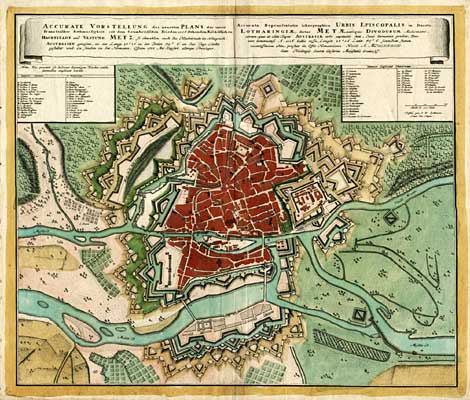 "Accurate Vorstellung des neuesten Plans der ... Haubtstadt & Vestung Metz ..." Stadtplan von Metz altkol. Kupferstich Nürnberg 1739(d) 49 x 58 cm
