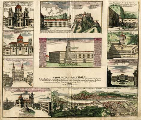 "Prospectus elegantiores splendidissimae Archiepiscopalis urbis Salzburgensis ..." Gesamtansicht von Salzburg, umgeben von 10 Teilansichten altkol. Kupferstich Nürnberg ca. 1720 49,5 x 57,5 cm