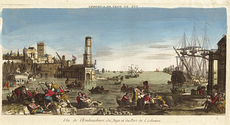 "Vue de l'Embouchure du Tage et du Port de Lisbonne." Guckkastenblatt mit einer Hafenansicht von Lissabon altkol. Kupferstich Frankreich ca. 1760/80 23 x 43 cm