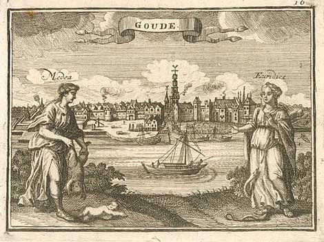 "Goude"Seltene Gesamtansicht aus den illustrierten Reisebeschreibungen "Der reisende Chineser" von David Fassmann.Kupferstich um 1730, 13 x 18 cm.