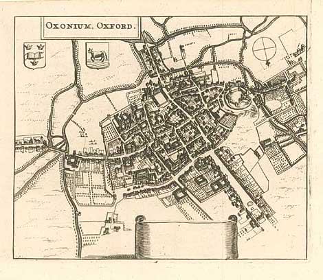 "Oxonium. Oxford."Ansicht von Oxford aus der Vogelperspektive mit den Stadtwappen.Kupferstich von J. Janssonius,Amsterdam um 1650,10,8 x 13 cm.