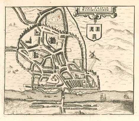 "Newe Castle. Novum Castrum."Ansicht von Newcastle aus der Vogelperspektive mit dem Stadtwappen.Kupferstich von J. Janssonius,Amsterdam um 1650,10,9 x 13 cm.