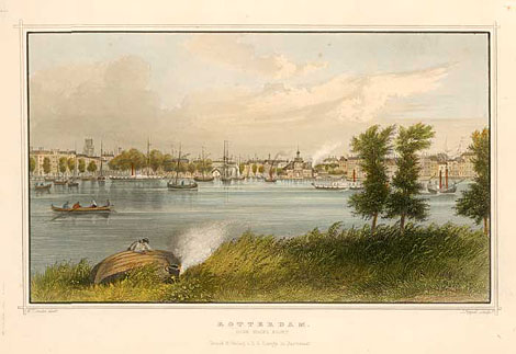 "Rotterdam"Ansicht von Rotterdam, vom Hafen aus gesehen.Kol. Stahlstich von J. Poppel nach Cooke,bei Lange, Darmstadt um 1850/60,13,6 x 21 cm.