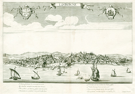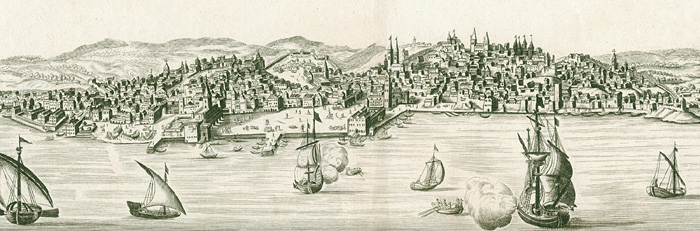 mit Segelschiffen im Vordergrund, Titelkartusche