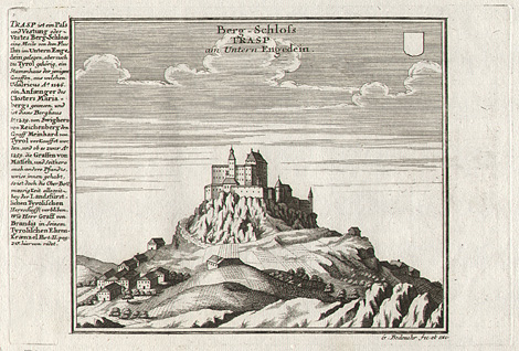 Ansicht von Tarasp mit dem Schloss aus dem 11. Jahrhundert, links neben dem Bild Text zur Geschichte in Deutsch.