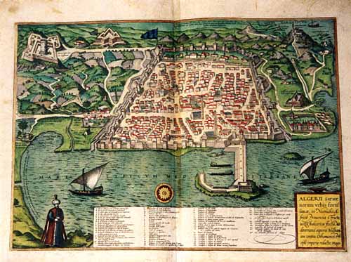 "Algerii saracenorum urbis..." Gesamtansicht aus der Vogelperspektive aus 'Civitates Orbis Terrarum' altkol. Kupferstich Köln ca. 1572/80 35 x 49 cm schönes Altkolorit, Ränder leicht fleckig, sonst gut erhalten Koeman B & H II / 59