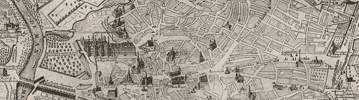 Stadtplan mit Gebäudeansichten aus der Vogelperspektive,