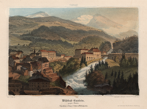 Altkolorierter Stahlstich, teilweise in Farben gedruckt, nach Georg Pezolt, aus dem „Album vom Salzburger Alpenlande“, gestochen und gedruckt von Serz, Nürnberg, verlegt bei J. Schoen, Wildbad Gastein / Salzburg, um 1850, 10,4 x 15 cm.