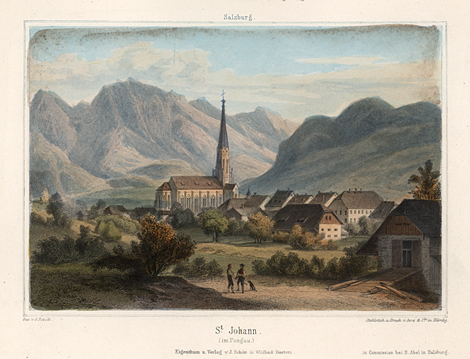 Altkolorierter Stahlstich, teilweise in Farben gedruckt, nach Georg Pezolt, aus dem „Album vom Salzburger Alpenlande“, gestochen und gedruckt von Serz, Nürnberg, verlegt bei J. Schoen, Wildbad Gastein / Salzburg, um 1850, 10,6 x 15,2 cm.