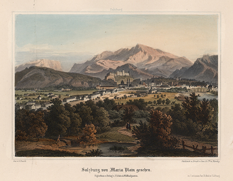 Altkolorierter Stahlstich, teilweise in Farben gedruckt, nach Georg Pezolt, aus dem „Album vom Salzburger Alpenlande“, gestochen und gedruckt von Serz, Nürnberg, verlegt bei J. Schoen, Wildbad Gastein / Salzburg, um 1850, 11 x 15,5 cm.