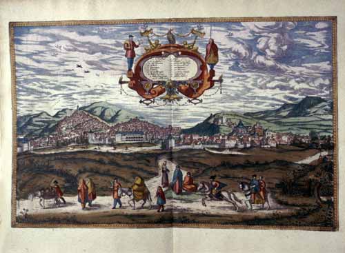 View of the city with a decorative cartouche drawn by G. Hoefnagel Antwerp 1563 from 'Civitates Orbis Terrarum' orig. col. copper engraving French edition Cologne 1572 - 1612 32,5 x 51cm Koeman B & H I / 04