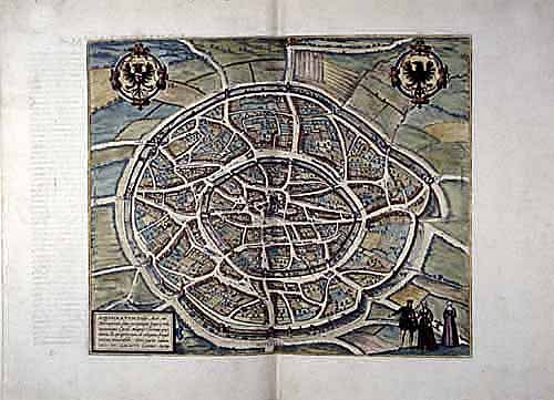 "Aquisgranum" Stadtplan aus der Vogelperspektive aus 'Civitates Orbis Terrarum' kol. Kupferstich Köln 1572 - 1612 32 x 39 cm Koeman B & H I / 12