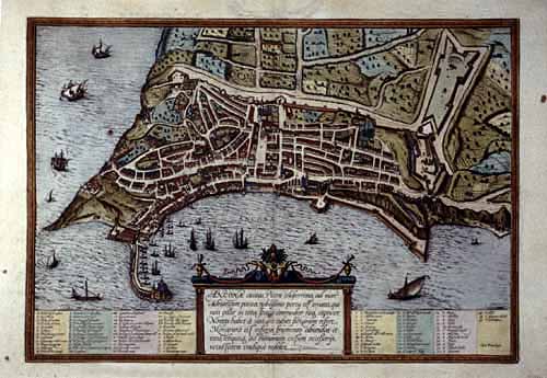 "Ancona civitas Piceni celeberrima..." Gesamtansicht aus der Vogelperspektive von Georg Hoefnagel aus 'Civitates Orbis Terrarum' Kol. Kst. von Braun & Hogenberg Köln 1572 - 1612 33,5 x 49 cm Koeman B & H I / 46