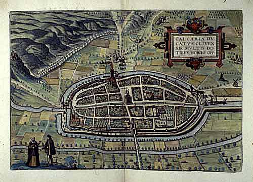 "Calcaria, ducatus Clivensis..." bird's-eye view from 'Civitates Orbis Terrarum' col. copper engraving Cologne 1572 - 1612 32,8 x 47,3 cm Koeman B & H II / 35