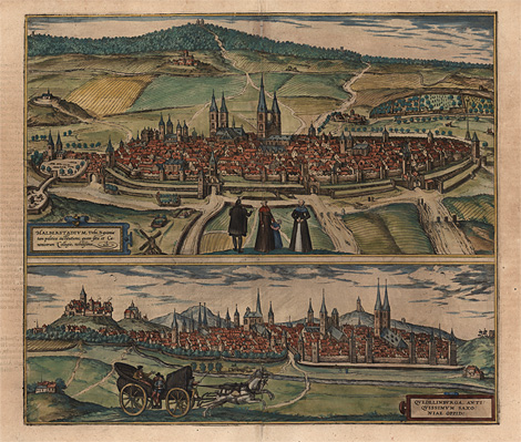 "Quedlinburga" 14,4 x 41,8 cm 2 views on one sheet from 'Civitates Orbis Terrarum' col. copper engraving Cologne 1572 - 1612 37,2 x 41,8 cm Koeman B & H III / 41