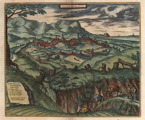 "Velitrae vulgo Blitri depingebat" Gesamtansicht von Georg Hoefnagel aus 'Civitates Orbis Terrarum' kol. Kupferstich Köln 1572 - 1612 34,5 x 39,5 cm Koeman B & H III / 53