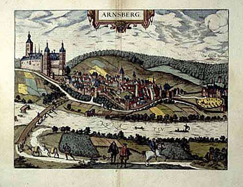 "Arnsberg" Gesamtansicht aus 'Civitates Orbis Terrarum' Kol. Kst. von Braun & Hogenberg Köln 1572 - 1612 32 x 43 cm Koeman B & H IV / 22