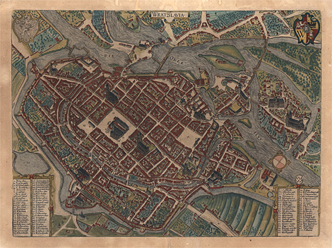 "Wratislavia" Gesamtansicht aus der Vogelperspektive aus 'Civitates Orbis Terrarum' kol. Kupferstich Köln 1572 - 1612 36,2 x 48 cm Koeman B & H IV / 42