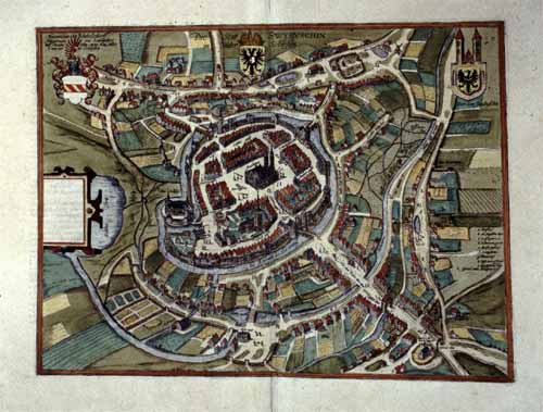 "Die Stat Swybuschin in Niderschlesien" Gesamtansicht aus der Vogelperspektive aus 'Civitates Orbis Terrarum' kol. Kupferstich Köln 1572 - 1612 34,3 x 45,6 cm Koeman B & H V / 50