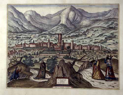 "Fondi depingebat G. Houfnaglius A 1578" general view by G. Hoefnagel 1578 from 'Civitates Orbis Terrarum' col. copper engraving Cologne 1572 - 1612 34,8 x 46 cm Koeman B & H V / 62