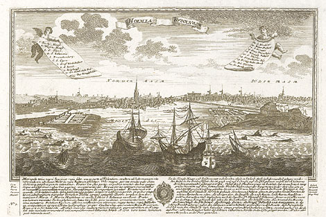 "Holmia – Stockholm"Gesamtansicht vom Meer aus gesehen mit Beschreibungen zur Stadt in Deutsch und Latein.Kst. von J.F. Leopold, Augsburg ca. 1720, 20 x 30 cm.Mit Privileg und Nr. 3.