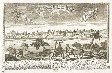 "Warsovia – Warschau"Gesamtansicht über die Weichsel (Wisla) mit Beschreibungen zur Stadt in Deutsch und Latein.Kst. von J.F. Leopold, Augsburg ca. 1720, 20,2 x 30 cm.Mit Privileg und Nr. 5.