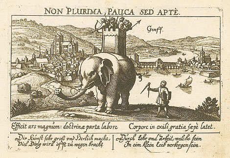 "Genff"Gesamtansicht, im Vordergrund ein Elefant mit Soldaten, unten ein Gedicht.Kst. von D. Meisner bei Paul Fürst, Nürnberg 1637/38, 10 x 14,5 cm.