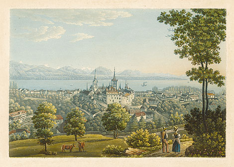 Gesamtansicht mit Blick zum Genfer See. Gouachiertes Aquatinta von S. Schmidt, Zürich ca. 1840, 12 x 17,5 cm.