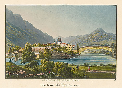 "Chateau de Reichenau, route de Splugen" Ansicht in Graubünden.Altgouachiertes Aquatinta bei F.H. Leuthold, Zürich ca. 1830.
