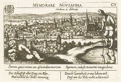 "Solothurn"Gesamtansicht, unten ein Gedicht.Kst. von D. Meisner bei Paul Fürst, Nürnberg 1637/38, 10 x 15 cm.