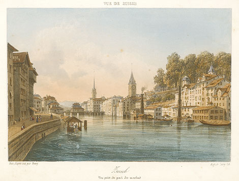 "Zurich, vue prise du pont des moulins" Teilansicht, Blick vom Bellvue.Altkol. Lithographie von A. Deroy, Paris ca. 1850/60, 16 x 23,4 cm.