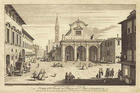 "A view of the Church and Piazza of St. Peter at Florence"Ansicht von Platz und Kirche St. Peter. Kst. im Stil eines Guckkastenblattes von N. Parr nach Zocchi, herausgegeben von R. Sayer, London 1750, 30 x 45 cm.