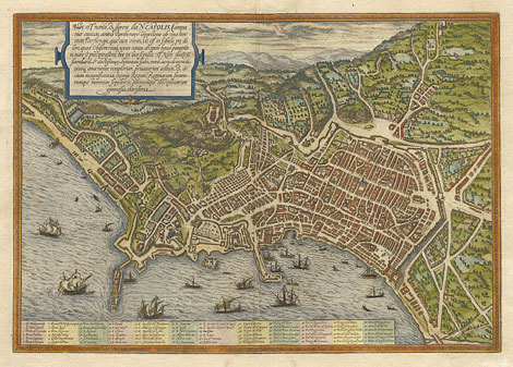 "Haec est nobilis et florens illa Neapolis..." Gesamtansicht aus der Vogelperspektive. Kol. Kst. von Braun & Hogenberg, Köln 1572 - 1618, 33,5 x 48 cm.Koeman B & H I / 47.