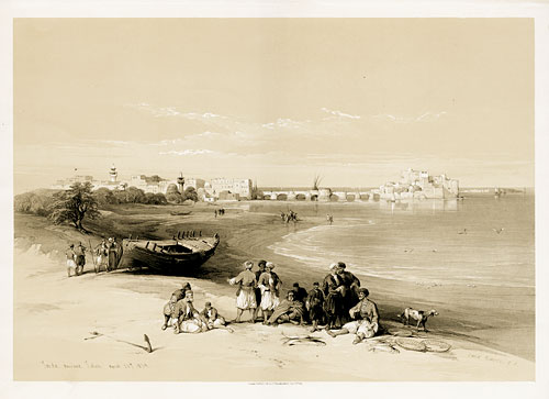 "Saida, ancient Sidon. April 28th 1839. David Roberts R.A." Titel: Sidon.Erste Ausgabe, Tonlithographie, ganze Seite, 35.5 x 51.2 cm.Früher der wichtigste Hafen Phöniziens.