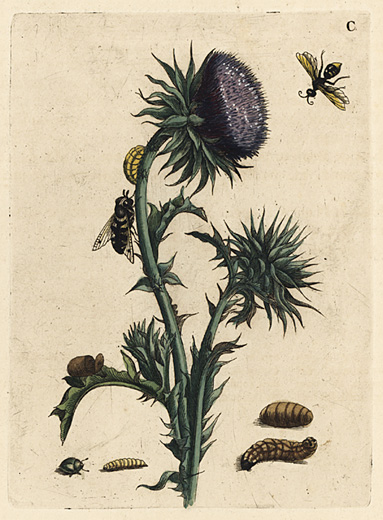 Altkolorierter Kupferstich zur Insekten- und Pflanzenkunde von Maria Sibylla Merian (1647 - 1717), erschienen um 1750. 15,5 x 11,5 cm.