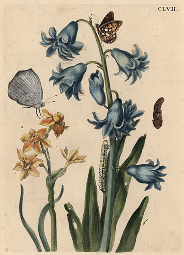Altkolorierter Kupferstich zur Insekten- und Pflanzenkunde von Maria Sibylla Merian (1647 - 1717), erschienen bei Jan Frederik Bernard, Amsterdam 1730. 20,5 x 15 cm.