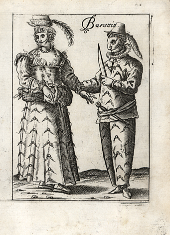 Radierung von Francesco Bertelli, aus: 'Il Carnevale Italiano Mascherato ...', Venedig 1642, 11,5 x 6 cm.