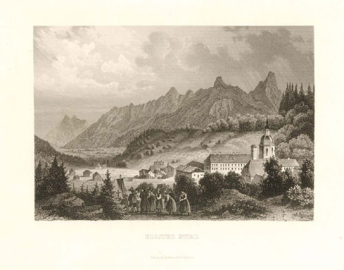 Ansicht des Klosters mit umgebender Landschaft und einer Prozession im Vordergrund.