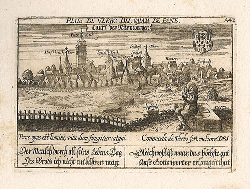 Gesamtansicht. Ansicht mit Beschreibungen und Versen 'Plus de verbo die quam de pane'.