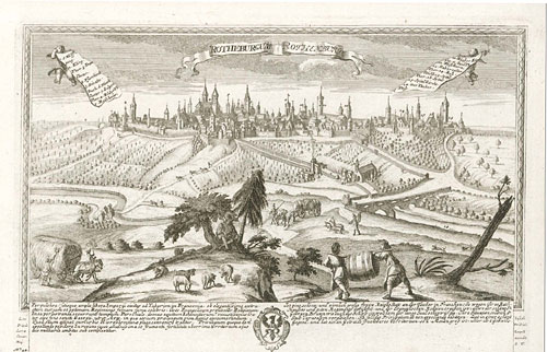 Gesamtansicht. Dekorative Ansicht mit Legende und lat. und dt. Texten zur Stadtgeschichte.