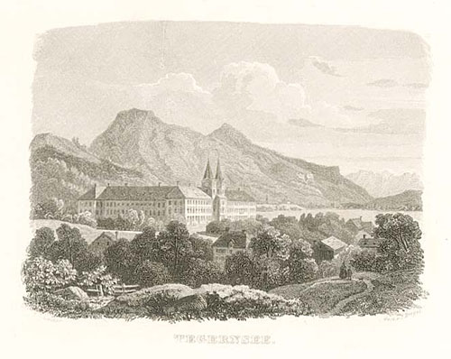 Ansicht von Kloster Tegernsee mit umgebender Landschaft.