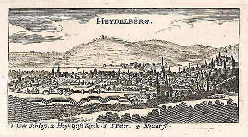 Kleine Gesamtansicht über die Stadt zum Neckar, mit Erläuterungen zu den wichtigsten Gebäuden.