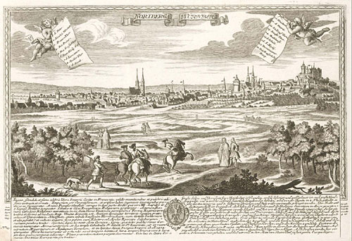 Sehr dekorative Gesamtansicht mit deutschen und lateinischen Texten zur Stadtgeschichte.