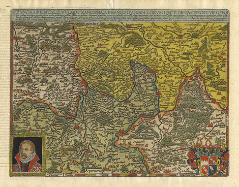 "Francia Orientalis, vulgo Franconia …" Karte von Franken, mit einem Porträt.Kol. Kst. von J. Bussemacher und M. Quad, Köln 1596. 23 x 30 cm.