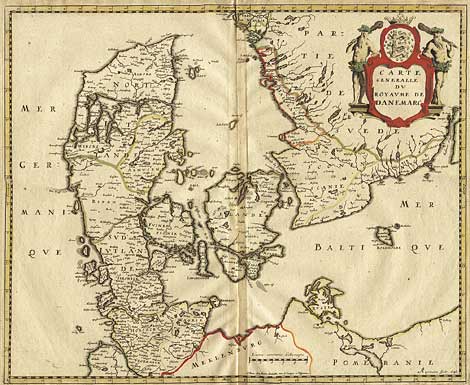 "Carte Generalle du Royaume de Danemarc."Karte des Königreichs Dänemark.Altkol. Kst. von A. Peyrouin bei Pierre Mariette, Paris 1646, 42 x 51 cm.