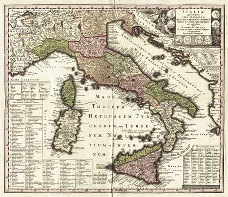 "Italiae antique item Insularum Siciliane, Sardiniae, Corsicae …"Karte des antiken Italiens.Altkol. Kst. von M. Seutter, Augsburg ca. 1730, 48,5 x 54,5 cm.Mit dekorativer Titelkartusche.