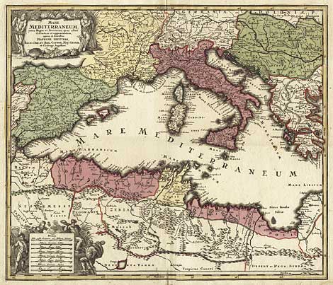 "Mare Mediterraneum, juxta Regna et Provincias ..."Karte des westlichen Mittelmeeres und seiner angrenzenden Länder (mit Griechenland).Altkol. Kst. von M. Seutter, Augsburg ca. 1730, 49,5 x 57 cm.