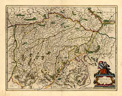 "Bavariae Ducatus" Map of the Duchy of Bavaria. Spanish edition. Orig. col. copper engr., Amsterdam c1640/50, 38,3 x 50,4 cm cm. Perfect condition, broad margins.